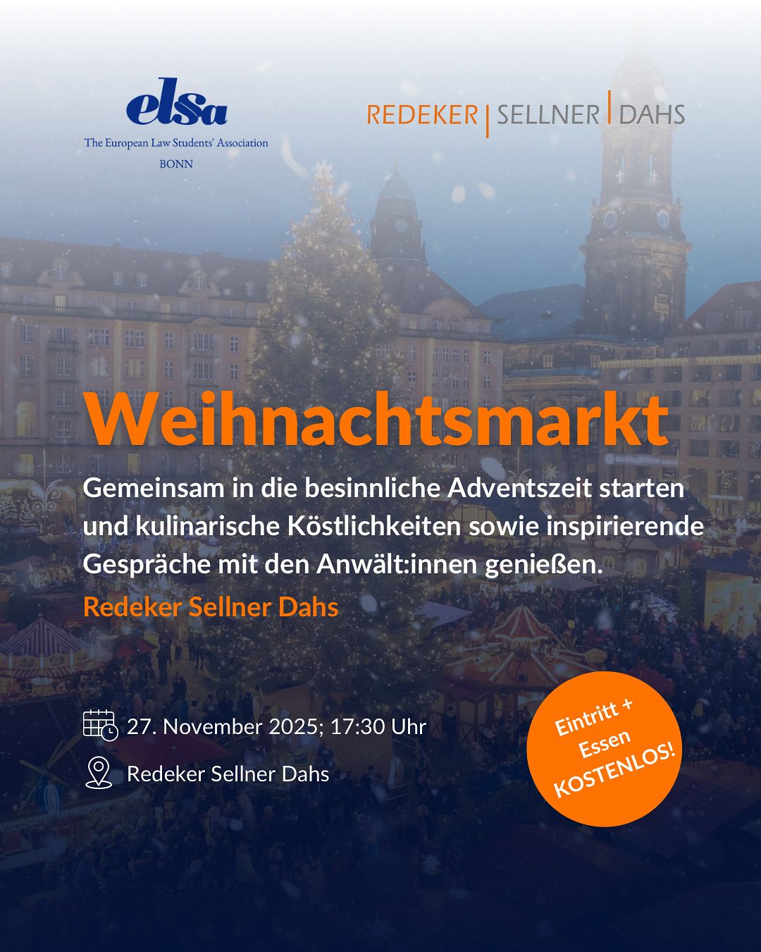 Redeker Sellner Dahs Willy Brandt Allee 11, Bonn, Deutschland🗓Datum: 27. November 2025 ⏰Beginn: 17:30 Uhr 📍Redeker Sellner Dahs Auch in diesem Jahr möchten wir Euch herzlich zum Redeker-Weihnachtsmarkt, welcher am 27. November ab 17:30 Uhr stattfindet, einladen. Lasst uns gemeinsam die besinnliche Adventszeit feiern und eine festliche Atmosphäre schaffen! 🎄 Der Markt wird eine Vielzahl von Ständen bieten, die kulinarische Köstlichkeiten und weihnachtliche […]